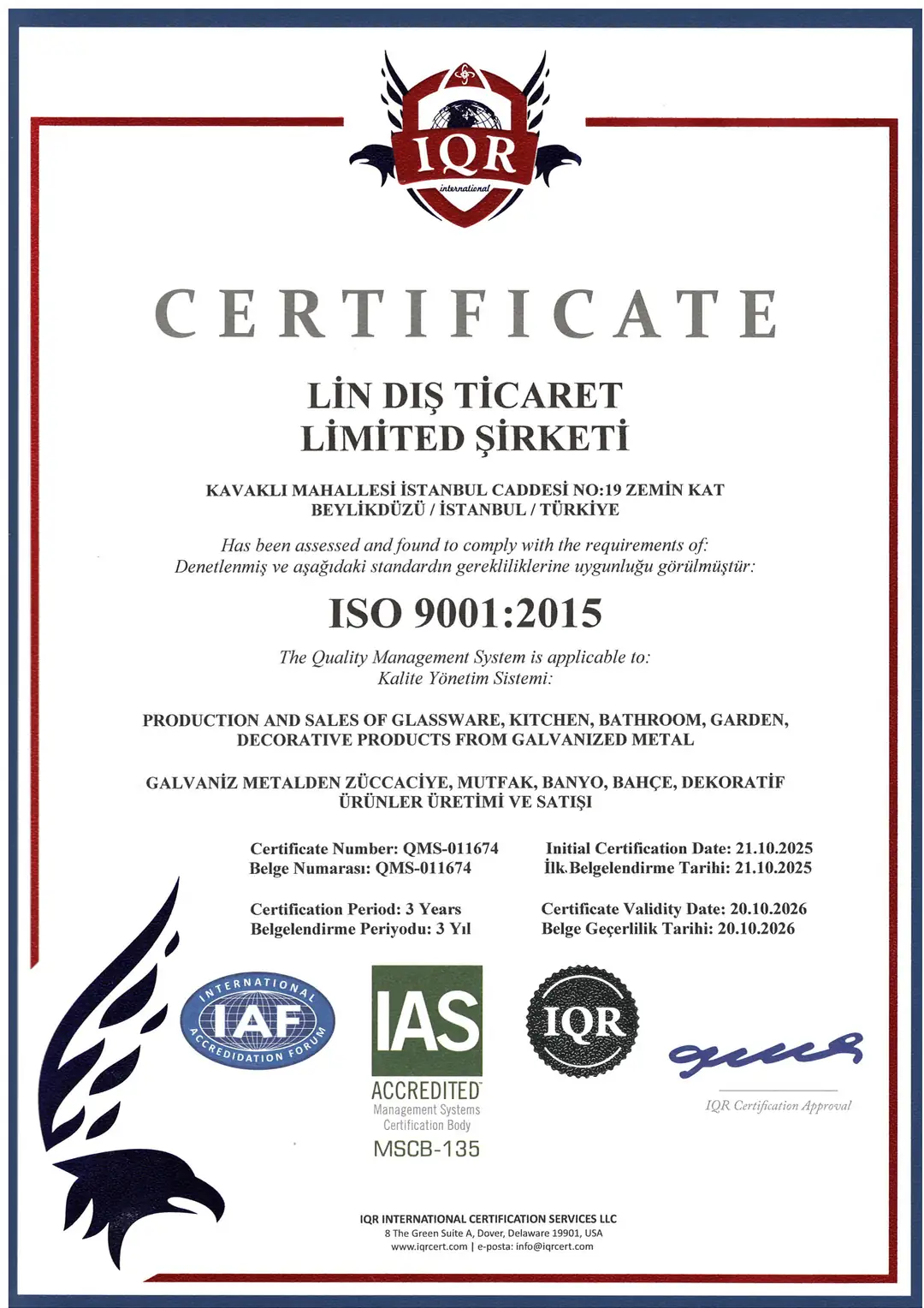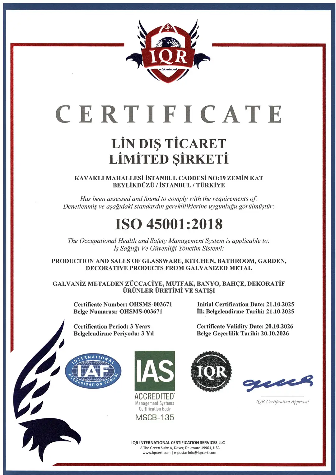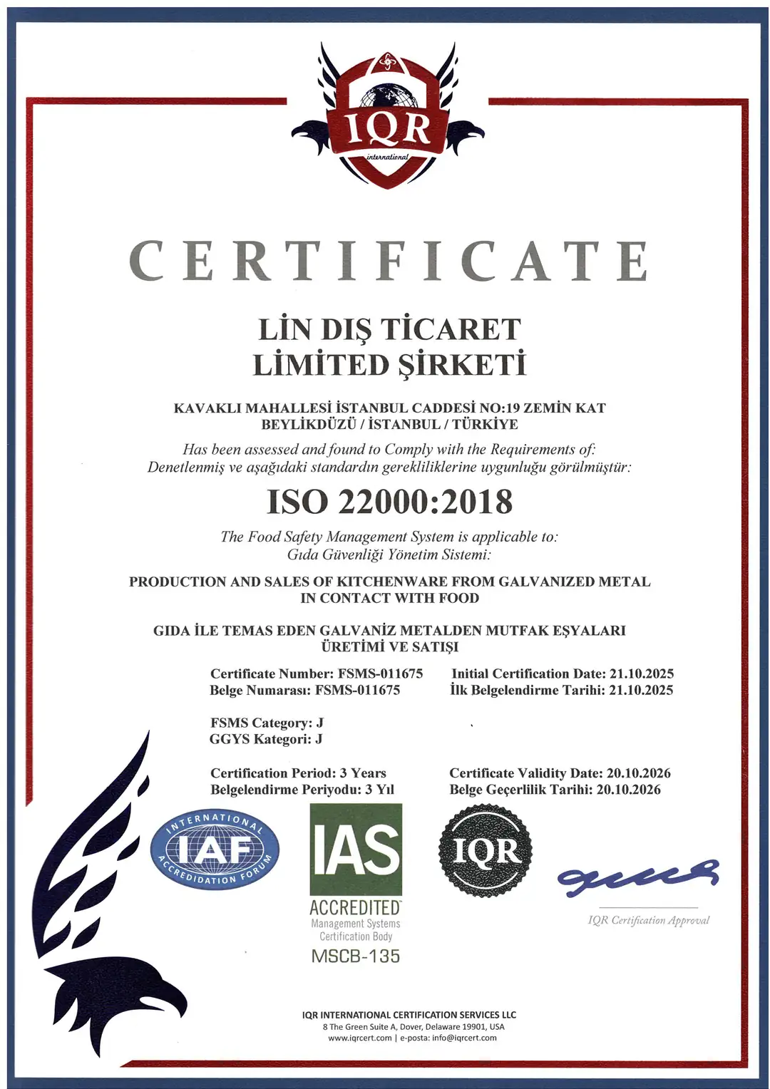 Lin Metal, kalite yönetimi, çevre yönetimi, iş sağlığı ve güvenliği ile gıda güvenliği alanlarında uluslararası standartlara uygun üretim yapar. Sertifikalarımız ve başarı belgelerimiz ile süreçlerimiz şeffaf ve denetlenebilir şekilde yürütülür.